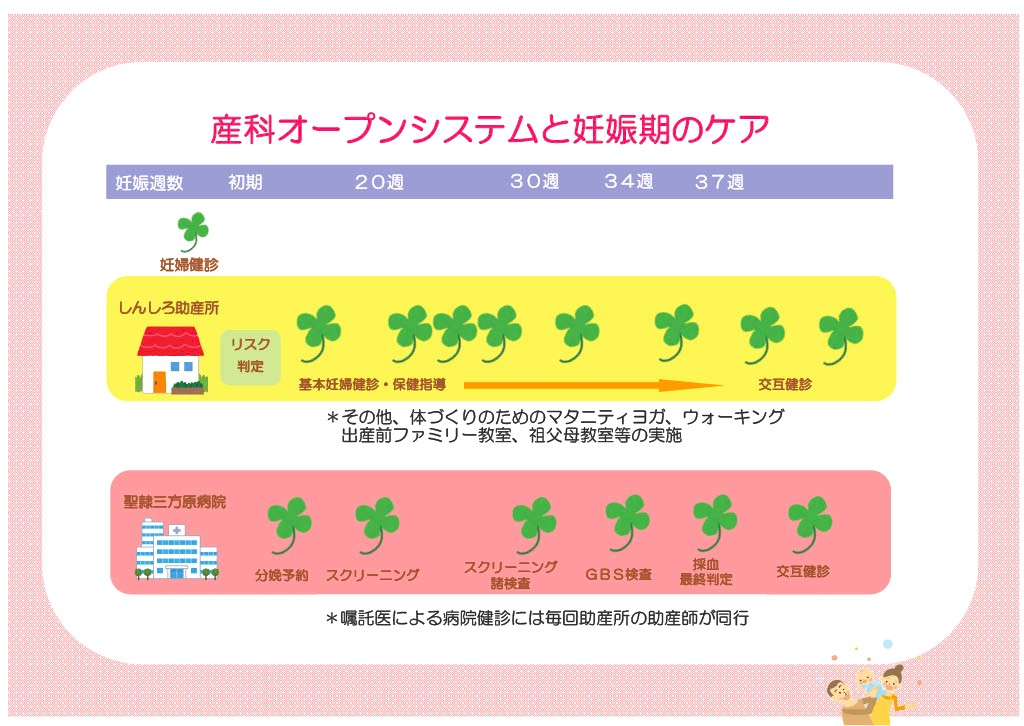 助産所という施設で産科オープンシステムを利用することで、異常時にはすぐ医療介入が可能な体制の中での助産師主体の関わり、また、妊娠期から分娩期、育児期までの継続的な関わりを通して“安心、安全、満足”を提供できるよう努めています。